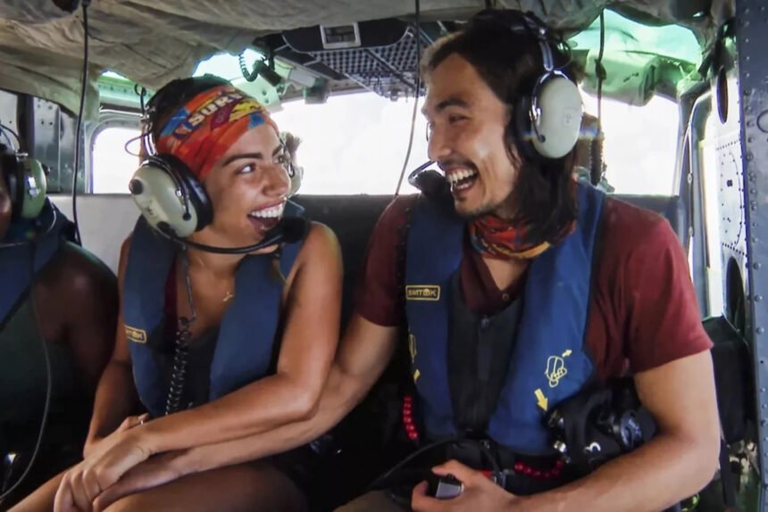 Dee Valladares (L) and Austin Li Coon (R) maintain arms throughout a helicopter reward in ‘Survivor 45’